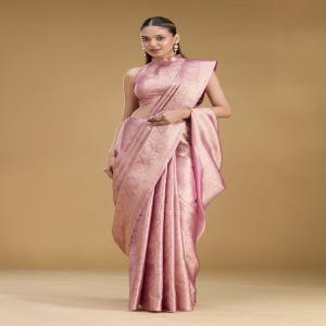 Light Lavender Silk_Saree in Tissue fabric. The Silk_Saree is elevated with Zariwork (Gold) embroidery. It comes with an Unstitched blouse. Comes with the Koskii promise of premium quality.