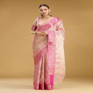 Pink Silk_Saree in Tissue fabric. The Silk_Saree is elevated with Zariwork embroidery. It comes with an Unstitched blouse. Comes with the Koskii promise of premium quality.